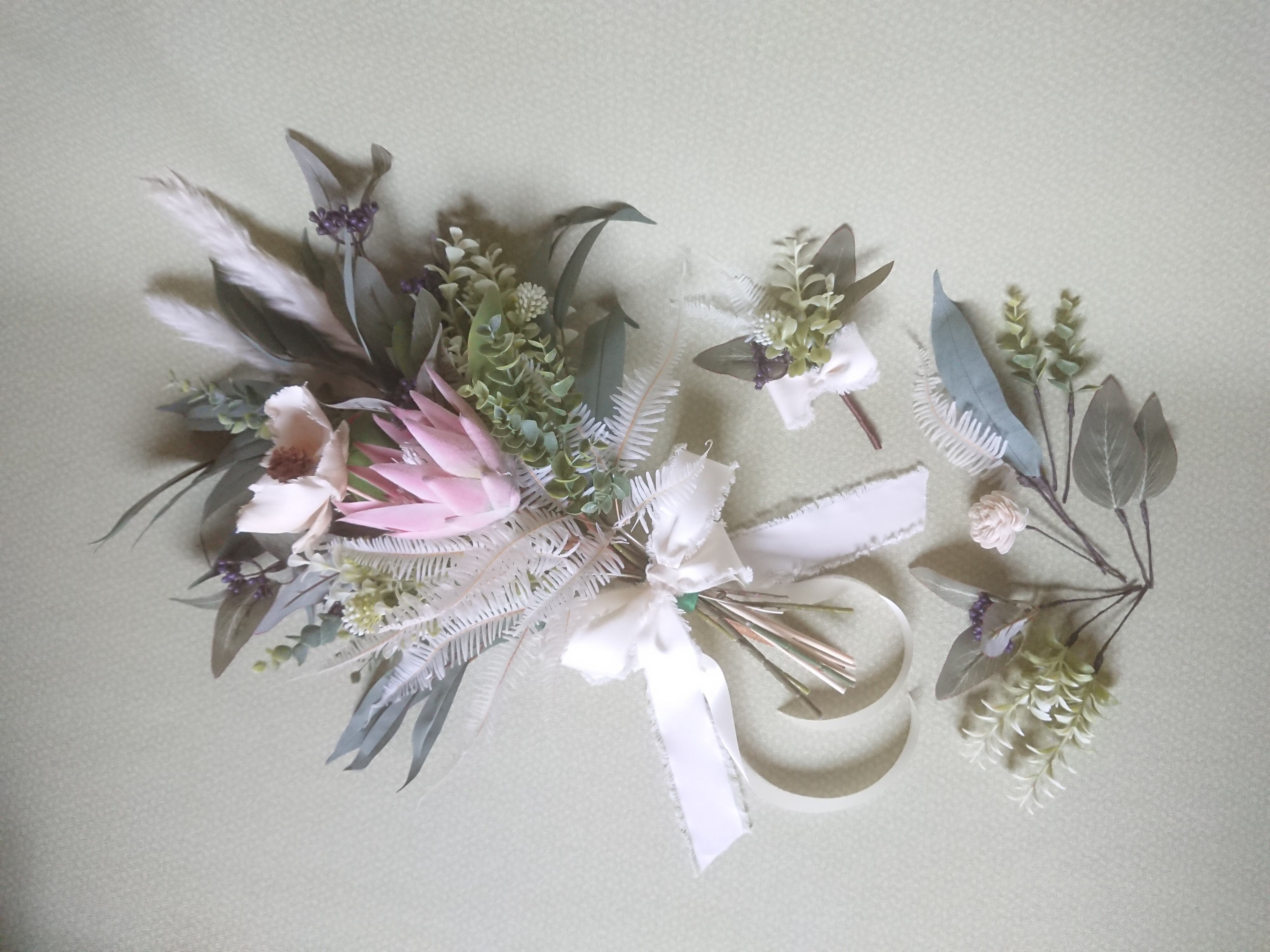 ブーケ、ブートニア、ヘアーパーツのセットなのでそのまま挙式やパーティー、海外ウェディングなどに使用できます!