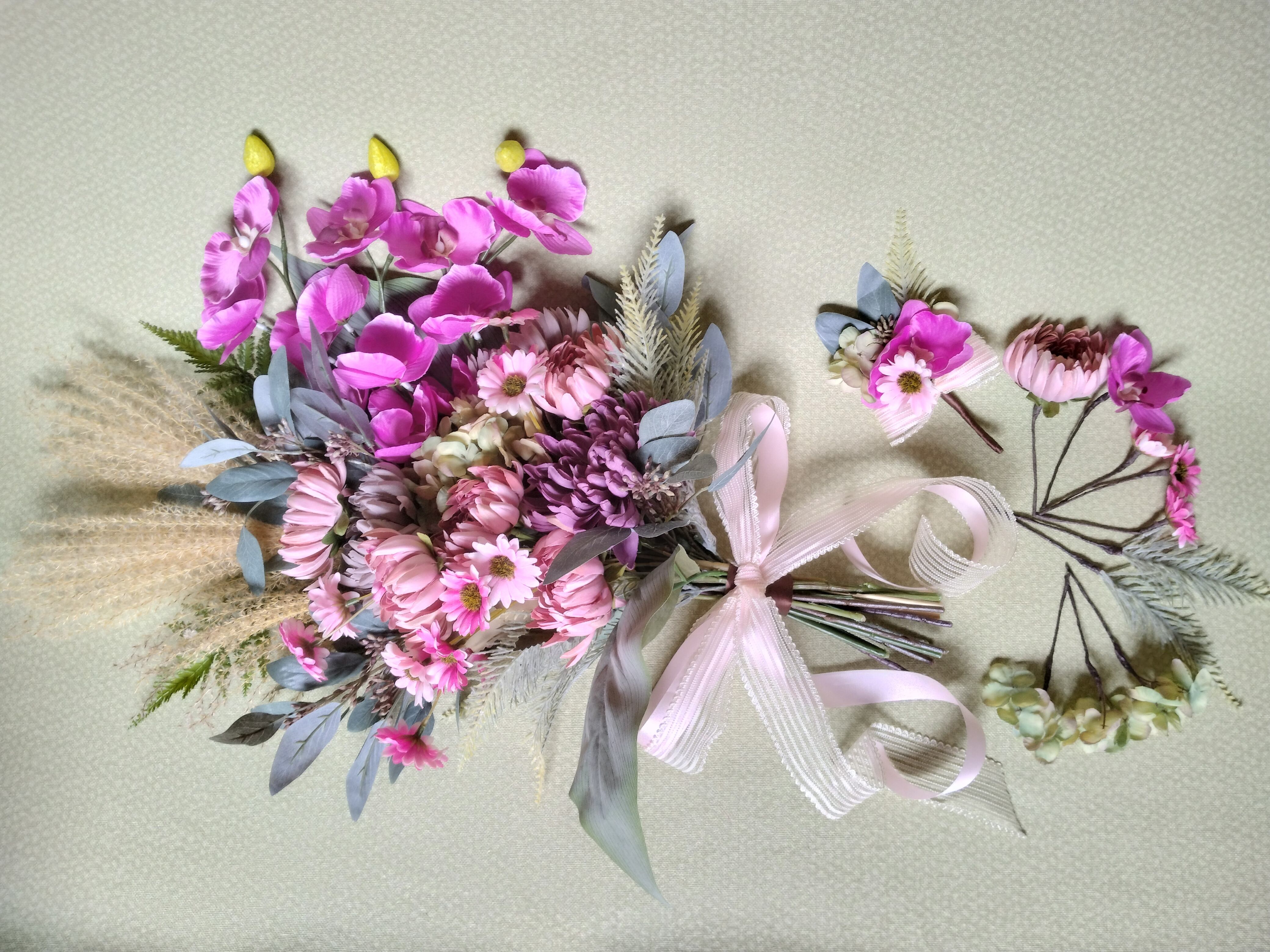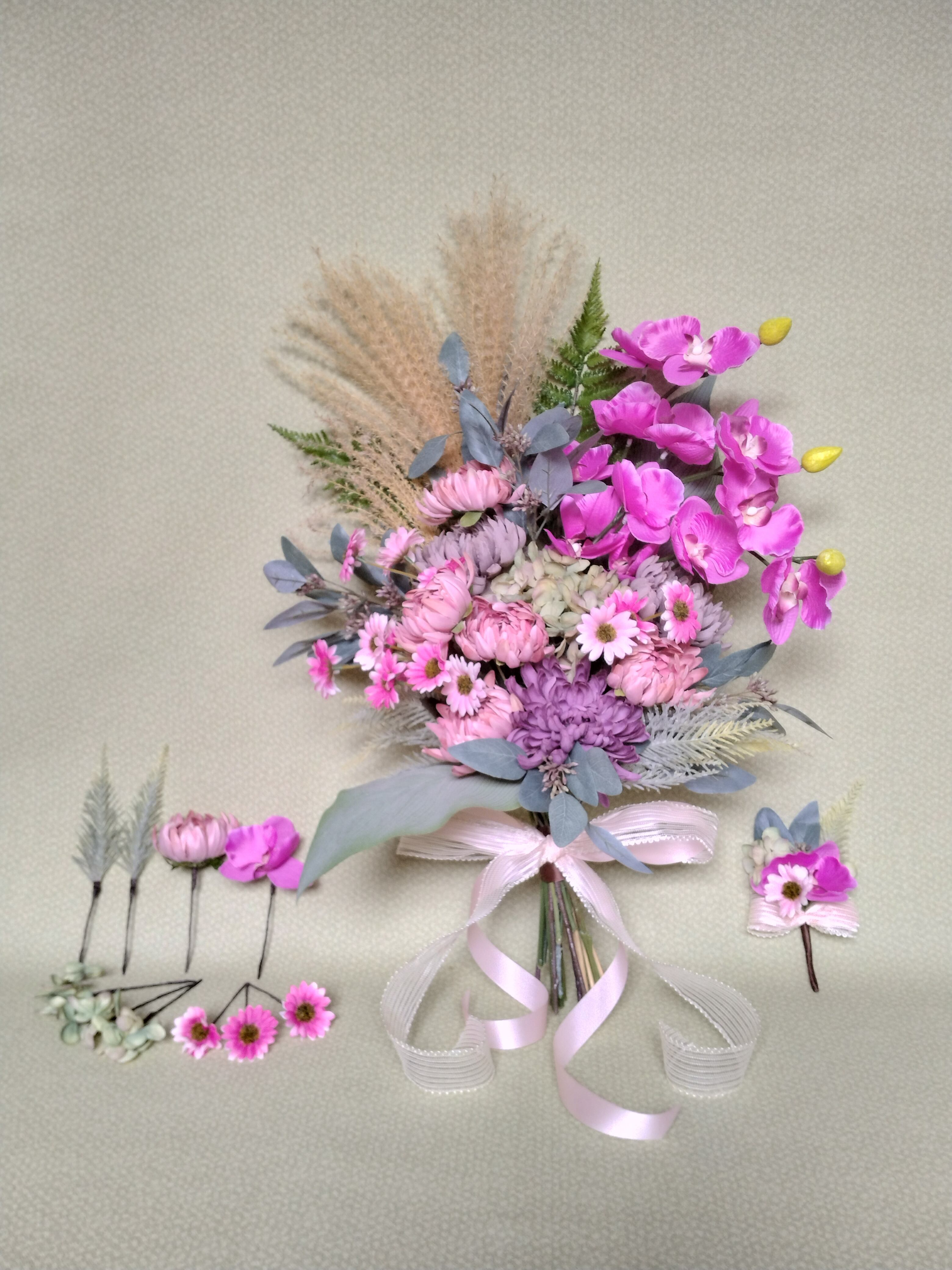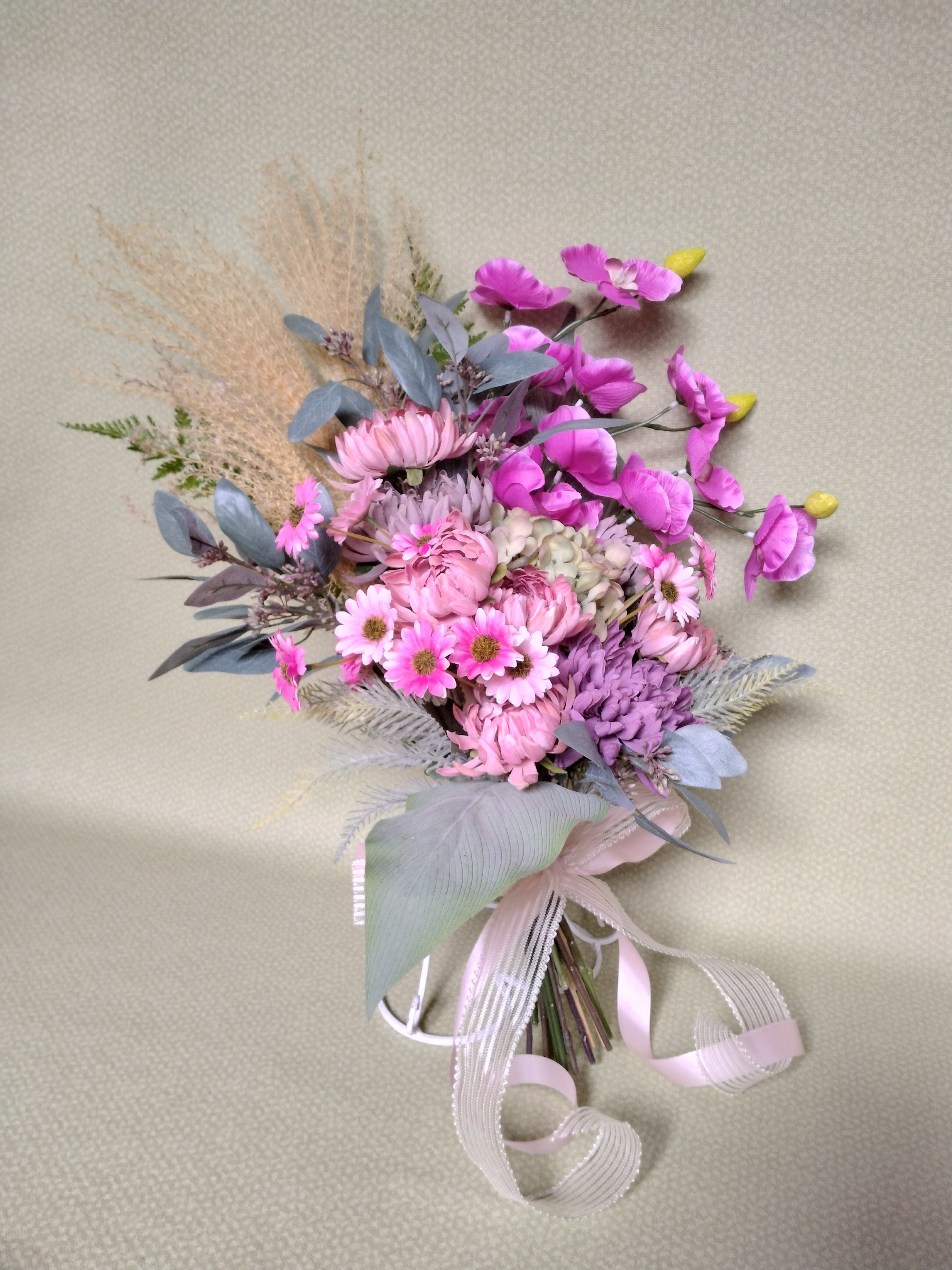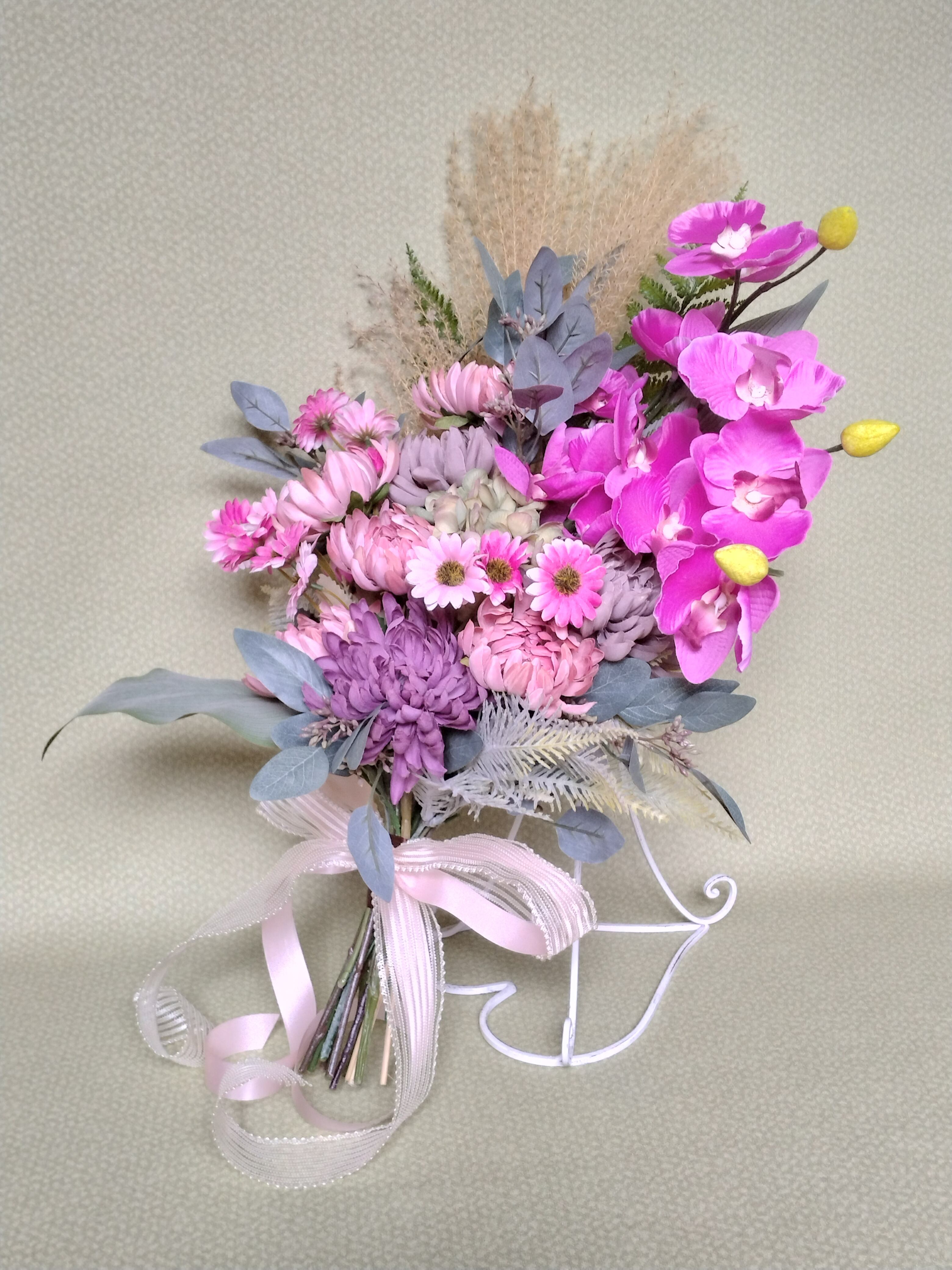 艷やかなピンクコチョウランで流れを出し、アンティークダリアで落ち着いた雰囲気に仕上げた束ねるタイプのクラッチブーケです。