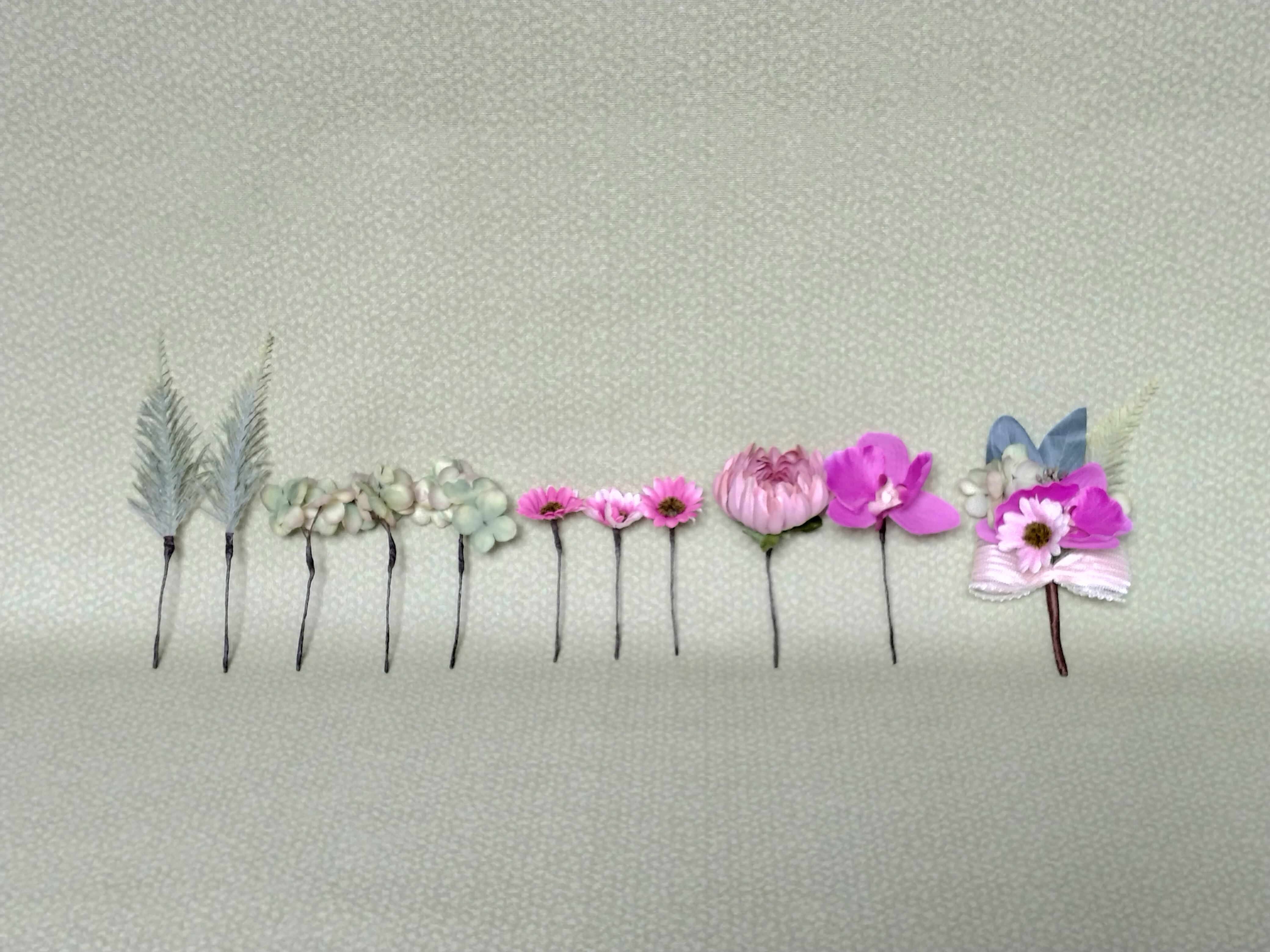 すべてアーテフィシャルフラワー(造花)や天然素材パーツでできております。