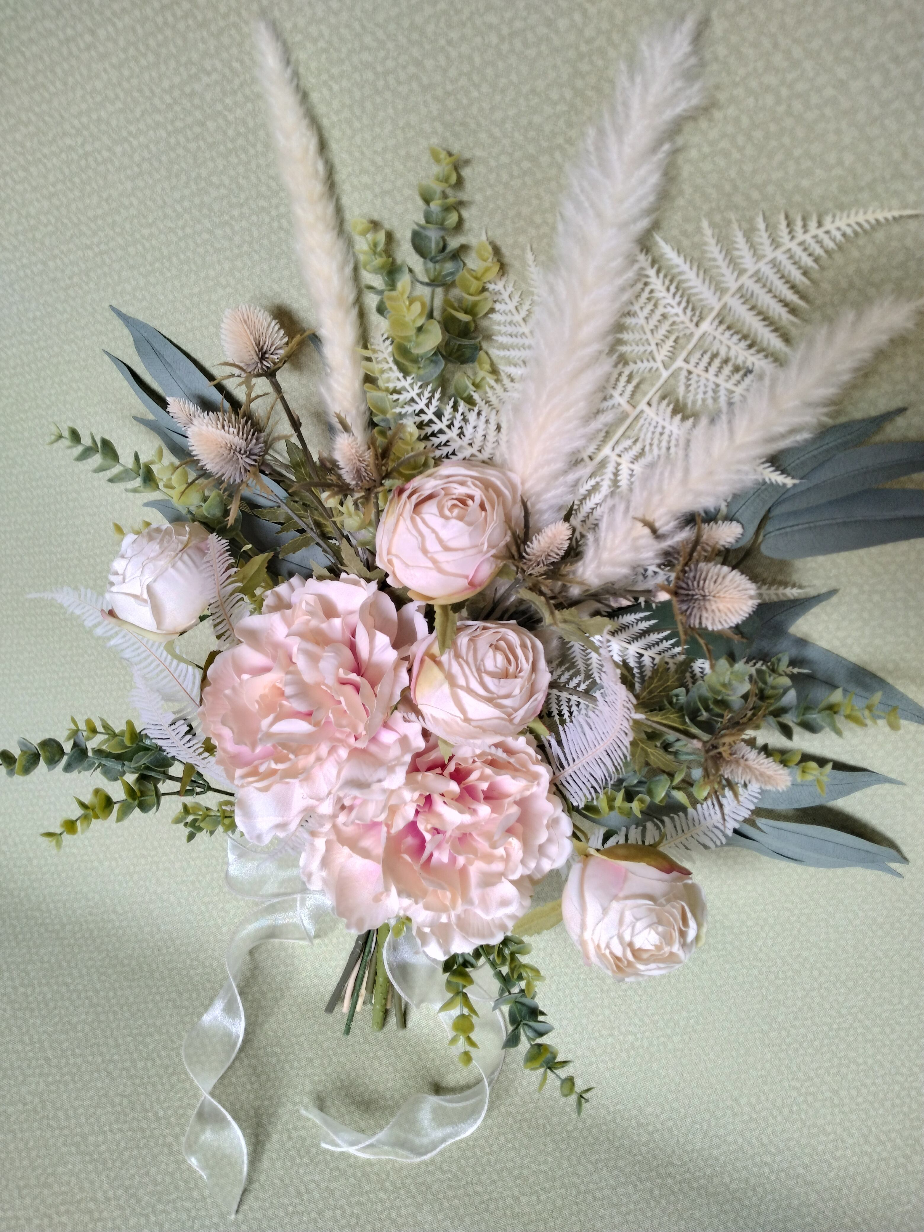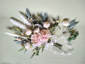 ボタニカル感いっぱいのパンパスやシダホワイト、グリーンで囲み、ドライフラワーを思わせる存在感バツグンの作品です。